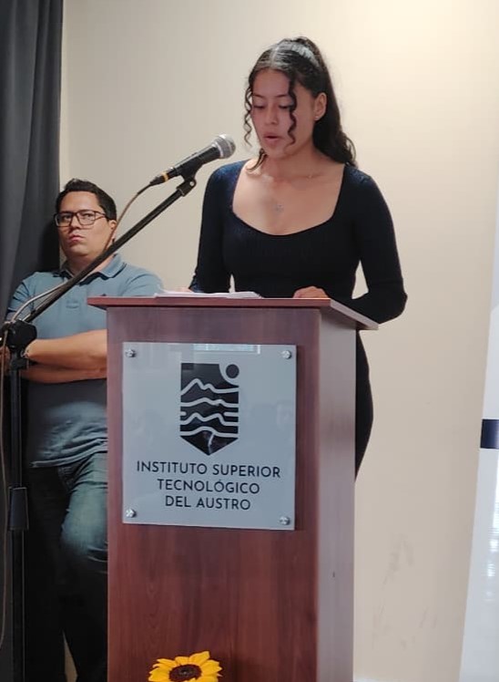 Como parte del acto protocolario, se procedió a la lectura del acta de resultados y, posteriormente, a la firma y entrega de actas a los estudiantes, organizada por grupos. En representación de sus compañeros, intervino la Srta. María Concepción Solís, quien obtuvo una de las mejores calificaciones del examen complexivo, motivando a su promoción a mantener el compromiso con la excelencia y la mejora continua.